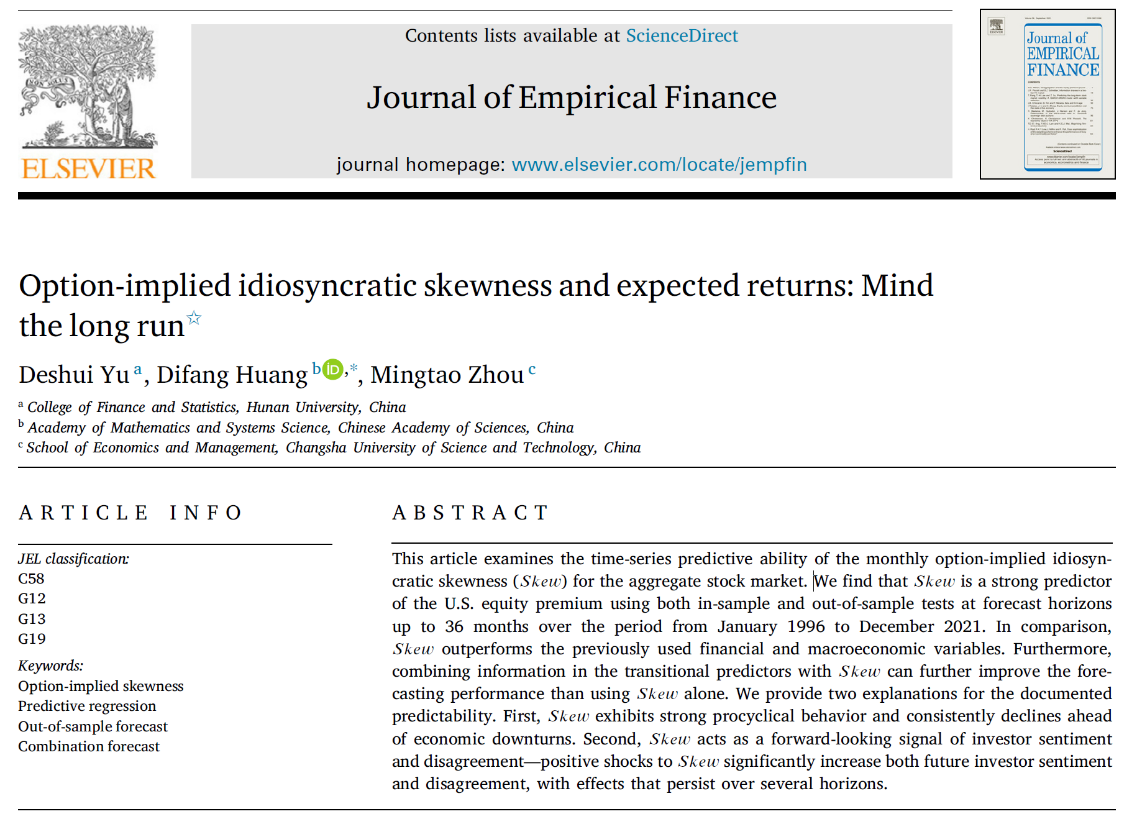 近日,新葡京博彩官网 金融科技与工程系余得水副教授的论文“Option-implied idiosyncratic skewness and expected returns: Mind the long run”在院定A2类期刊Journal of Empirical Finance,volume 83,September2025发表。