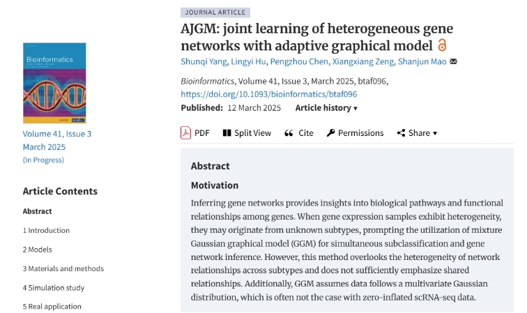 近日,新葡京博彩官网 统计与数据科学系毛善骏助理教授,与信息科学与工程学院曾湘祥教授、新葡京博彩官网 2024级硕士研究生杨顺淇、2022级硕士研究生胡凌一、2021级本科生陈鹏舟合作的题为“AJGM: joint learning of heterogeneous gene networks with adaptive graphical model”的论文在生物信息学领域高水平期刊Bioinformatics, Volume 41, March 2025发表。