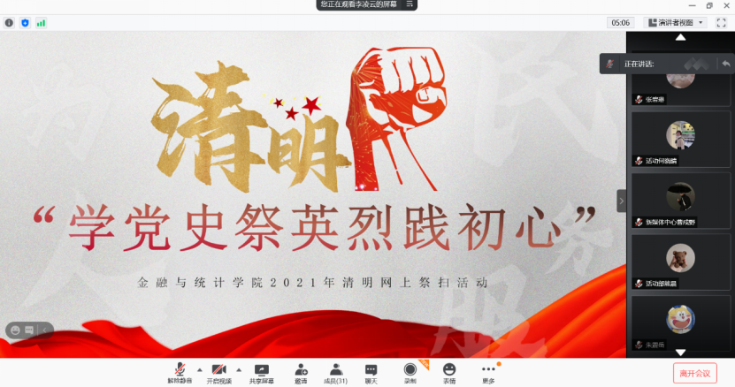 组织研究生开展“学党史祭英烈践初心”清明网上祭英烈活动,号召全院研究生以此为契机学百年党史,缅怀英烈,向英雄致敬。学院研究生辅导员、研究生党员代表、研究生骨干代表等四十余人参加线上活动。