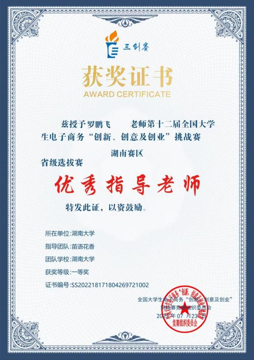 这种方式大大提升了学生的主动性和参与感,最终,罗鹏飞指导的项目取得省级一等奖的优秀结果。罗鹏飞本人也多次荣获“普惠金融·青春践行”大学生暑期社会实践和全国大学生电子商务“创新、创意及创业”挑战赛湖南赛区优秀指导教师荣誉。
