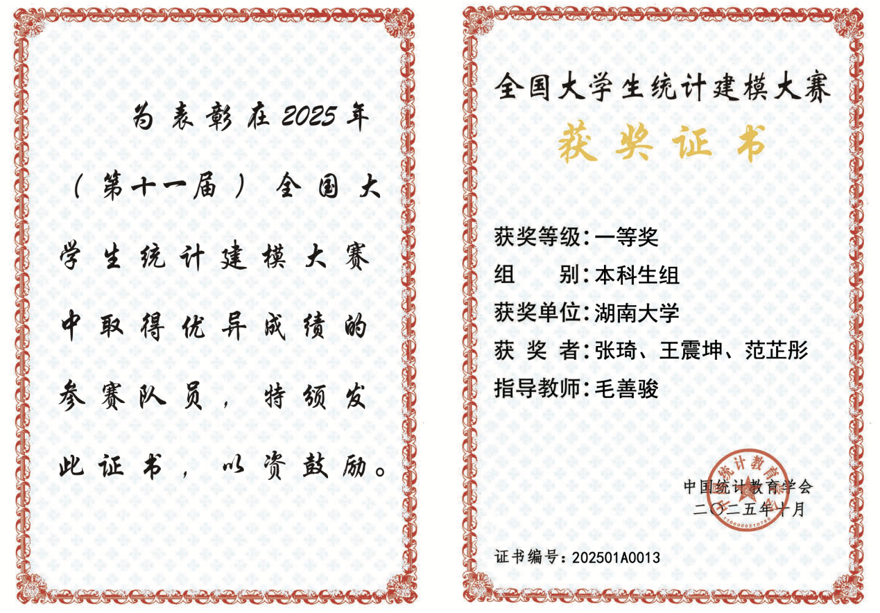 近日,第十一届全国大学生统计建模大赛(以下简称大赛)总决赛在东北财经大学成功举办。新葡京博彩官网-新葡京app 共有6支队伍入围国赛,分别获得本科生组全国一等奖1项、二等奖1项和三等奖3项,研究生组全国二等奖1项。