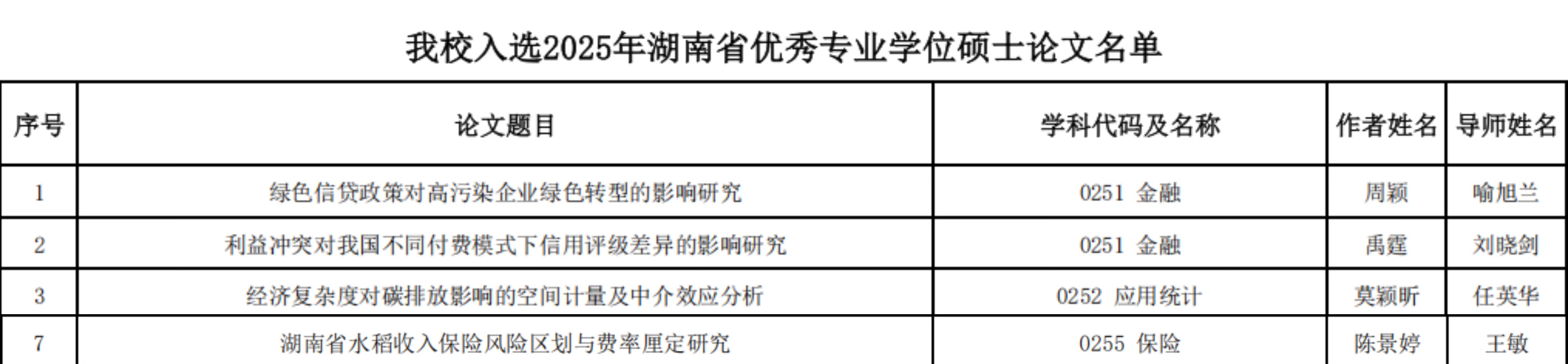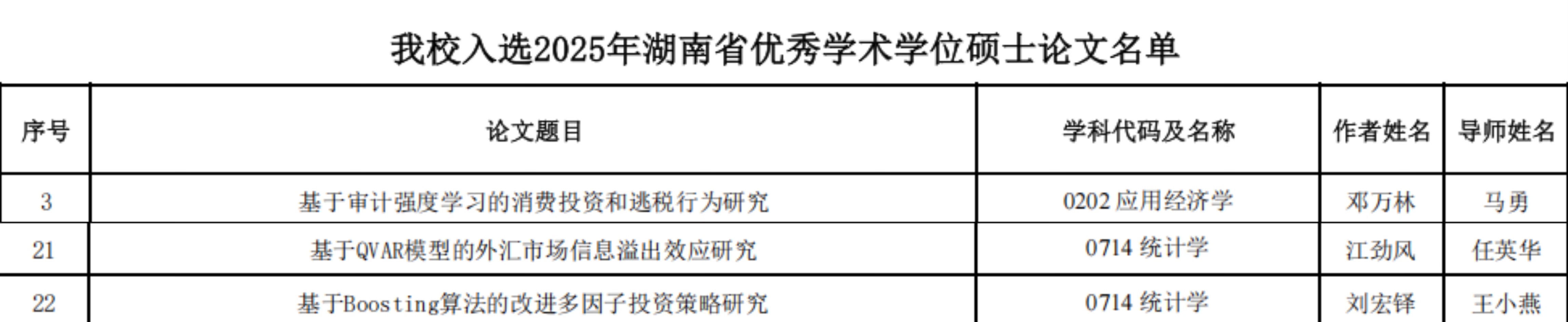 近日,湖南省教育厅公布了2025年湖南省优秀硕士学位论文名单,新葡京博彩官网 共有7篇论文入选湖南省优秀硕士学位论文,这7篇论文分别由新葡京博彩官网 马勇老师、任英华老师、王小燕老师、喻旭兰老师、刘晓剑老师、王敏老师指导。
